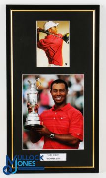 Tiger Woods 2006 Royal Liverpool Open Golf Champion Signed Photograph Display - including large colour press photograph holding the Claret Jug and a Nike Publicity Signed Card - mf&g overall 21" 11.75"