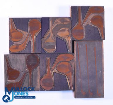 Interesting Collection of Scottish Clubmakers Woods Advertising Copper Printing Block Plates (6) mostly D Anderson & Son St Andrews to incl 5x blocks displaying different woods models incl Fairway with sole plate, Acme with rear counter balance back weight and sole plate, The Viceroy with face insert and rear counter balance back weight, Matched Driver with horn sole insert, Empire with three quarter sole plate - 2x plates are stamped British - plus another block displaying a set of woods probably a driver, brassie and spoon approx. 6" x 3.5" Note: From The Estate of The Late David Easby