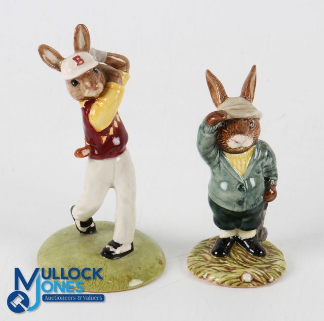 2x Royal Doulton 'Bunnykins' Golfing Figures - 1984 "Bogey Bunnykins" figure with Royal Doulton Stamp Mark, pattern no. D832 to the base overall 4"h; and "Golfer Bunnykins" figure with makers stamp mark, pattern no. DB255 and 'inspection label signed C Humphries' to the base, dated 2001, overall 5"h Note: From The Estate of The Late David Easby