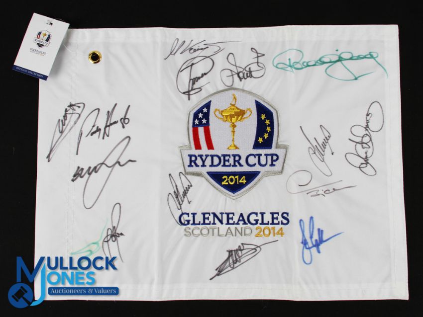 2014 Ryder Cup Gleneagles European Team Signed Embroidered Pin Flag - signed by Paul McGinley (capt), players Rory McIlroy, Jamie Donaldson, Graeme McDowell, Thomas Bjorn, Ian Poulter, Lee Westwood, Justin Rose, Stephen Gallacher, Dubuisson, et al incl vice-captain Padraig Harrington in all 15