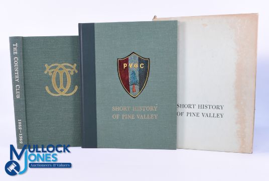 2x Famous Early American Golf Club Histories - John Arthur Brown - 'Short History of Pine Valley" 1st edition 1963 printed privately in USA, in the decorative green and gilt cloth boards together with the original slip case. A nice history of this great course includes early black and white photos of the course under construction including the use of steam winches and horse teams to contour the course (G); and Elmer Osgood Cappers "The Centennial History of The Country Club 1892-1982- Brookline" 1st ed Publ'd privately c/w colour frontis piece of Francis Ouimet and other illustrations throughout.in the original green and gilt cloth boards and spine (G) Note: From The Estate of The Late David Easby