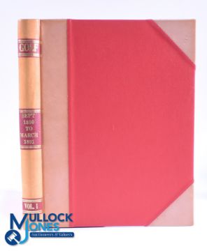 Rare 1890/1891 "Golf - A Weekly Record of 'Ye Royal and Ancient Game" weekly produced newspaper bound volume - comprising a complete run from No.1 Vol.1 Friday 19th September 1890 to Vol. 26 March 16th 1891 - complete with Index - rebound in half leather, red and gilt cloth title to spine - mine of information what did stand out see p. 415 Edinburgh University Golf club played a competition in March at Musselburgh with "fully one inch of snow - hence the high scores"!!! - c/w advertisements and various illustrations - in remarkable condition with some slight speckle foxing otherwise internally very clean (G). A very captivating book which is very difficult to put down !!! Note: From The Estate of The Late David Easby