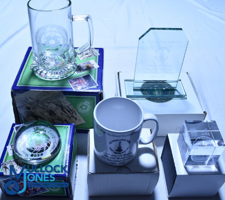 Football glassware - 100 years Centenary Collectables x2, Lairg Sutherland Scotland West Auckland FC Trophy and Mug and a Football League Wembley Stadium resin paper weight