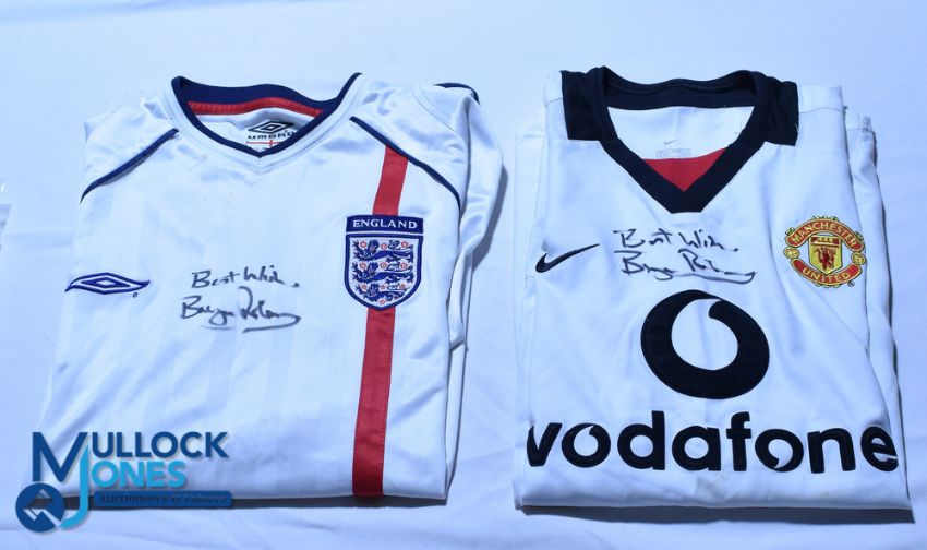 Two Bryan Robson autographed shirts. England 2001-2003 Size L and Manchester United 2002-2003 Size 39/41, away shirt, unwashed/some marks