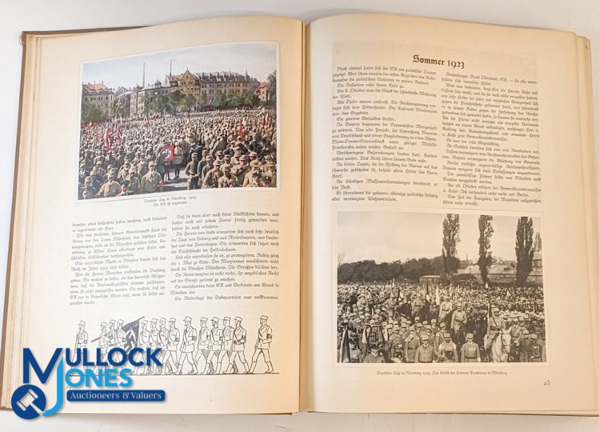 Third Reich - Deutchland Erwacht [Germany Awakes], First Edition 1933 - Good condition and appears complete with all inserted illustrations. Large folio, brown cloth boards with gilt title and motif of the head of a Nazi Stormtrooper. 150pp with large folded panorama of the first Nuremberg Rally to rear. An infamous and now very rare publication issued by the Nazi Party at the very beginning of their rule. The object of the book was to chronicle the rise of the Nazis and the great achievements that they made even in the first year of their rule. The book featured several illustrations which were inserted as 'stickers' by the purchaser of the book