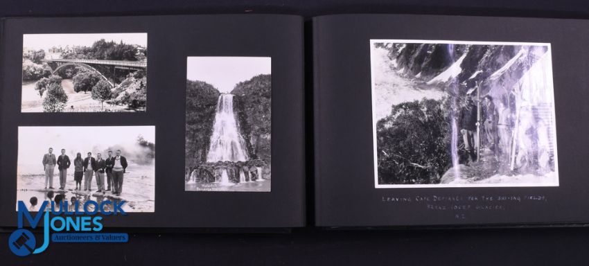1930 British & I Lions Personal Photo & P/cards Album: Over 100 of Gordon Bonner's pictures and postcards, collected during the 1930 tour, of people, places and events in NZ, in an immaculate dark blue hardbacked album. Part of the WGM Bonner 1930 BRFT Lions Collection