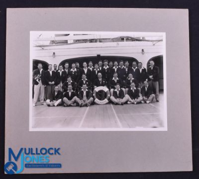 1930 British & I Lions On-Board Team Photograph: 8.5" x 7.5" mounted b/w photo of the team in blazers/flannels aboard the Rangitata en route to NZ. Very clean. Part of the WGM Bonner 1930 BRFT Lions Collection