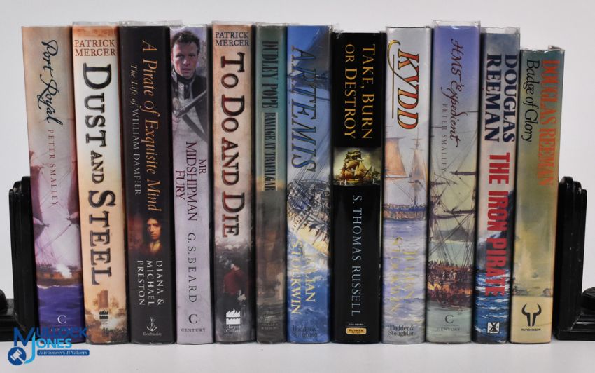Modern Naval Fiction - approx 23 titles of modern naval fiction, mostly first eds, all in good condition. Authors include: Dudley Pope, Douglas Reeman, Patrick Mercer, Showell Styles, Iain Gale, Alexander Kent, Julian Stockwin, Peter Smalley, G S Beard, S Thomas Russell, and others (3 Boxes)