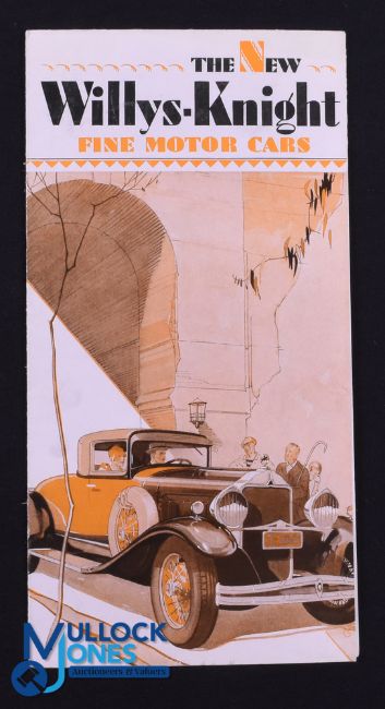 The New Willys Knight Fine Motor Cars Sales Brochure - early 1930s. An interesting 6 page fold out sales Brochure with illustrations of these 6 models of their Cars, plus technical specifications with detailing text. Printed on quality semi-gloss paper, folds out to size 15" x 19½"