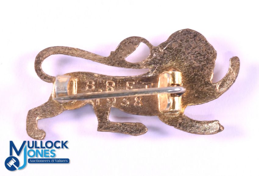1938 (not 1930) British & I Lions Gold Coloured Lapel Badge: The traditional, popular and sought-after gold-coloured lion badge officially supplied to the tourists down the years, with embossed 'BRFT 1938' to reverse. Very collectable. Part of the WGM Bonner 1930 BRFT Lions Collection