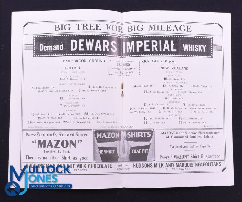 Rare 1930 Rugby Programme, British & I Lions v NZ, 1st Test: Official Programme from the famous Test won 6-3 by the Lions. Excellent. Part of the WGM Bonner 1930 BRFT Lions Collection