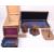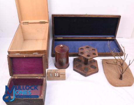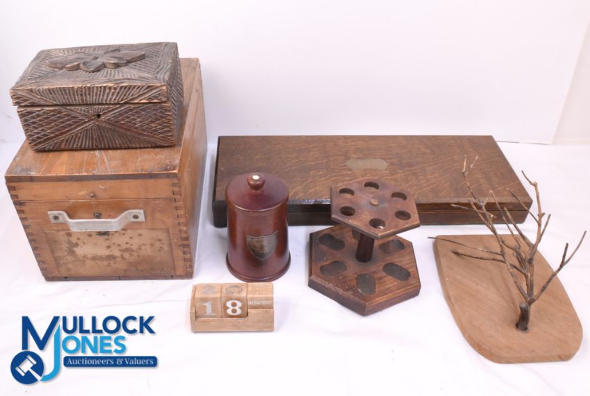 A small lot of seven wooden treen collectables including three storage boxes, a West African tobacco urn, a pipe stand, desk calendar and a display shield