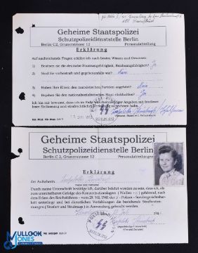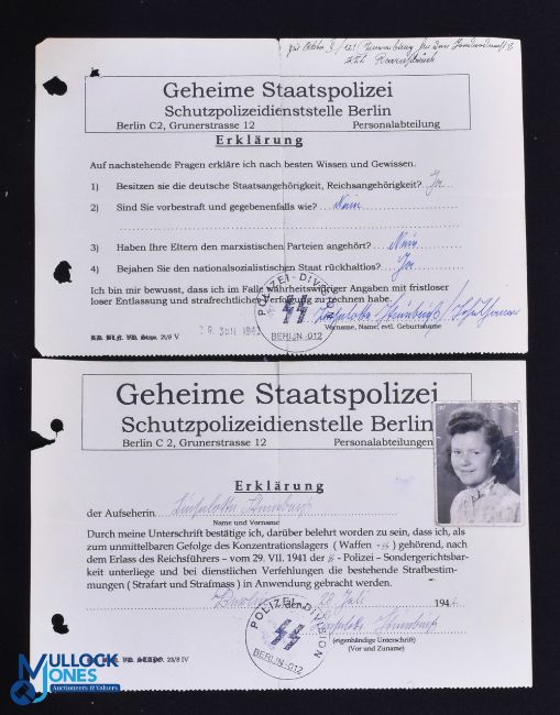 Third Reich - Gestapo printed form with ms insertions being a questionnaire issued to a female member of the K2 Guards - and therefore a member of the Waffen SS investigating various aspects of her behaviour but stating that only the laws of the SS will be used in case of 'crimes'. Rare