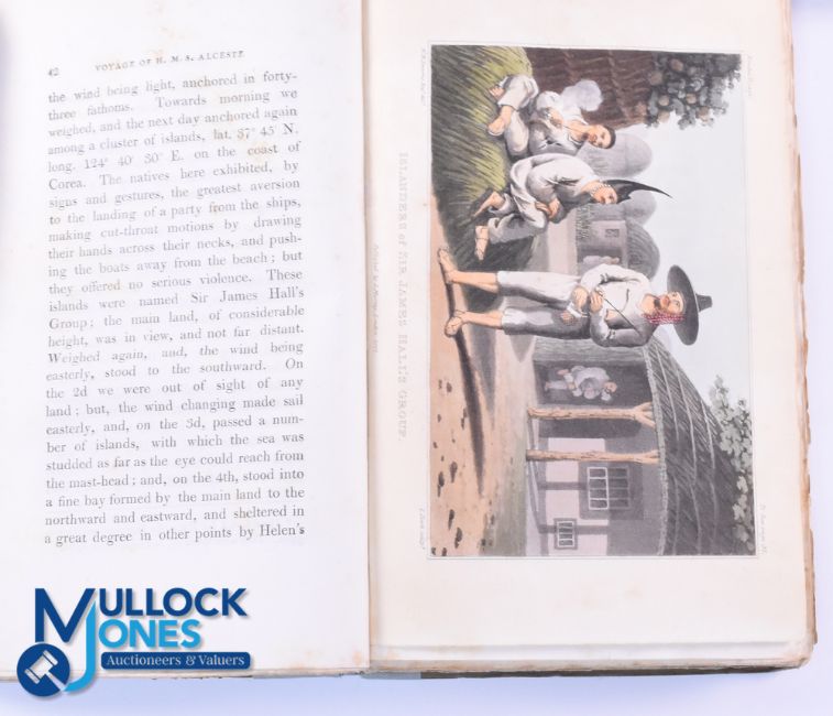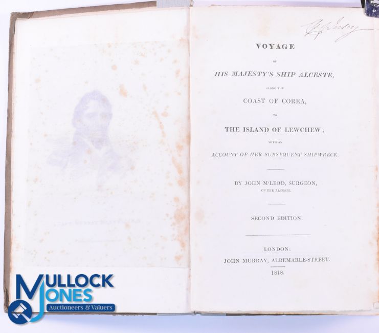 China - Voyage of HM Ship Alceste Along The Coast Of Corea To The Island of Lewchew With An Account Of Her Later Shipwreck by John McLeod, Surgeon 1818. A 323 page book with all 5 plates as called for, 4 of which finely hand coloured. Describing Lord Amhurst mission to the Emperor of China, detailing its people and their customs, shipwreck on returning, rescue, on voyage home meeting Napoleon at St Helena. In In board covers, size 5¾" x 9"