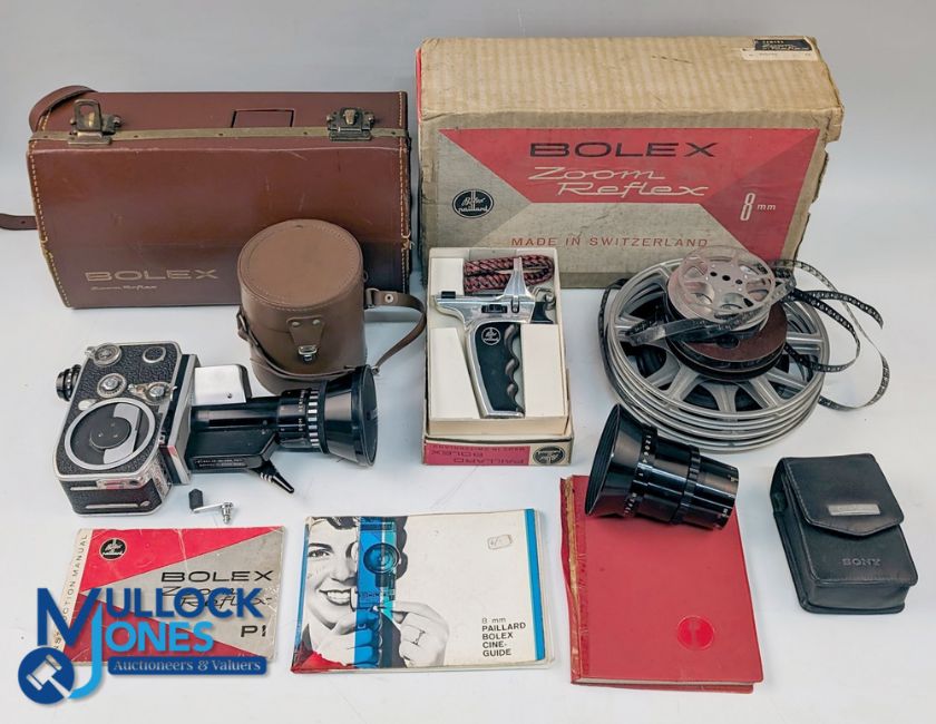 Bolex Zoom Relex P1 8mm Camera in leather case with instructions handbook, the leather case has 1 broken leather strap, plus Berthiot hyper pan lens, reel of 9mm film some Laurel & Hardy and empty reel,