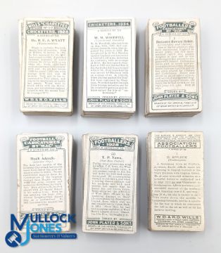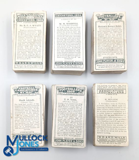 Six full sets of 50 Cigarette Cards - Will's Cricketers 1928, John Player Cricketers 1934, John Player Football Caricatures by RIP 1926, John Player Football Caricatures by MAC 1927, John Player Footballers 1928 and Wills Association Footballers 1939