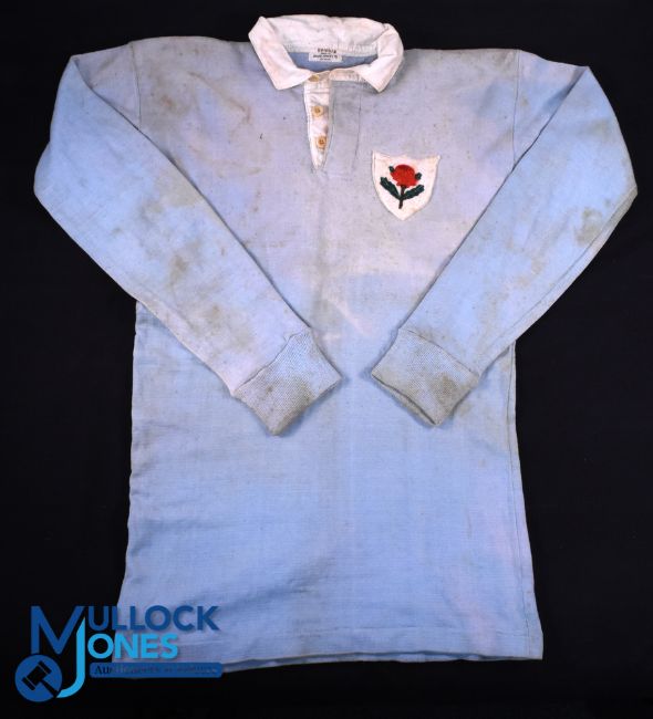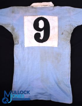 Rare 1930 NSW Waratahs Matchworn Jersey v British & I Lions: Clearly match worn including some staining, a very evocative pale blue jersey made by David Jones', with red Waratah badge, an NSW jersey from the game with the Lions in 1930 at Sydney, No. 9 to reverse, worn by D Telford of Manly. 'Bonner' inked to label. Good for age and of course, rare and desirable memorabilia. Part of the WGM Bonner 1930 BRFT Lions Collection