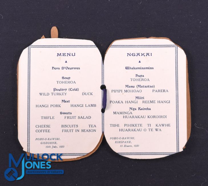 1930 British & I Lions Maori Interest, Gisborne Dinner Menu etc (2): Really attractive and interesting, small fold over bilingual menu for a dinner offered by Maori to the Lions at Gisborne. The outer has been covered by a multicoloured folk-art style fabric decoration, depicting a warrior face with the traditional tongue-poking, a lovely item, VG. Part of the WGM Bonner 1930 BRFT Lions Collection