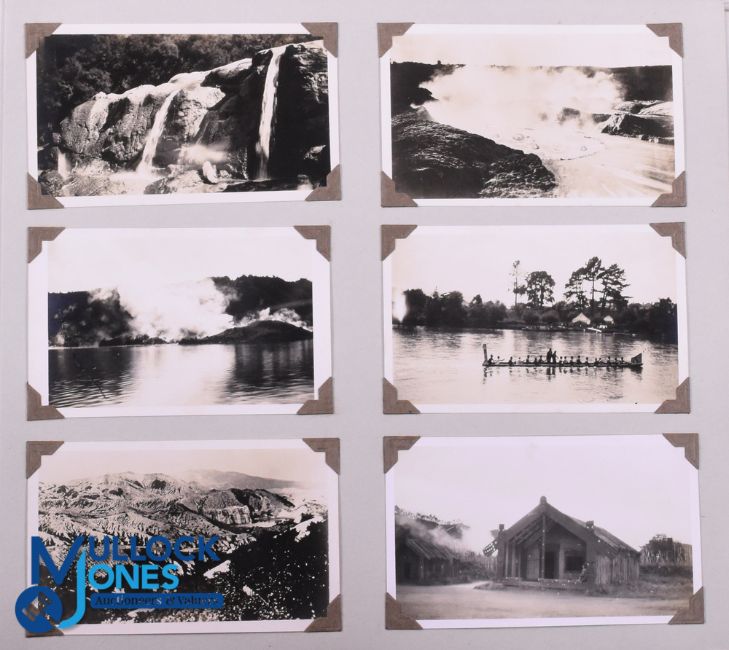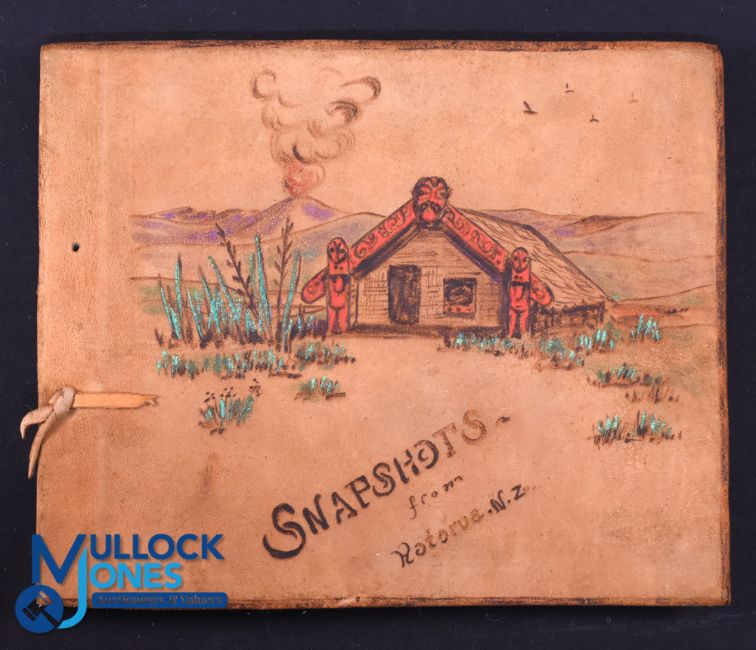 1930 British & I Lions Special Personal Photo Album with Rotorua/Maori Interest: Suede-covered, with poker work titles and coloured Maori hut decoration, attractive large album partly filled with 54 4.5" x 2.5" b/w photographs taken by Gordon Bonner etc, of players, natives etc in beautiful landscapes, at hotels and amongst the snowy mountains, rushing streams and bubbling hot spring geysers of the area VG. Part of the WGM Bonner 1930 BRFT Lions Collection
