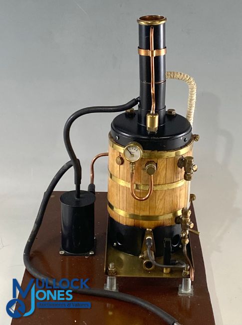 Kit Built Live Steam Model Vertical Engine Boiler 2 Valves, with burner, no makers name, on wooden base - possible missing some parts, size #20cm x 31cm x 41cm