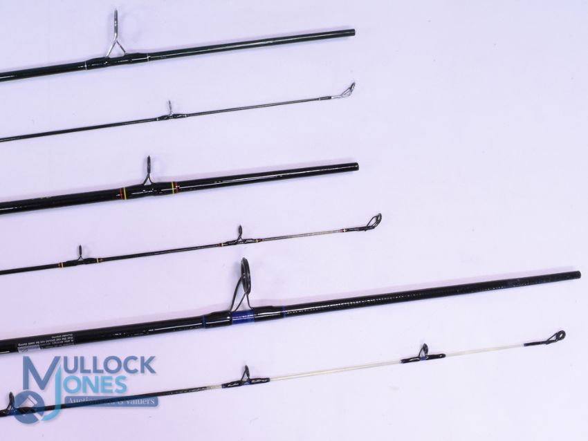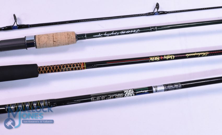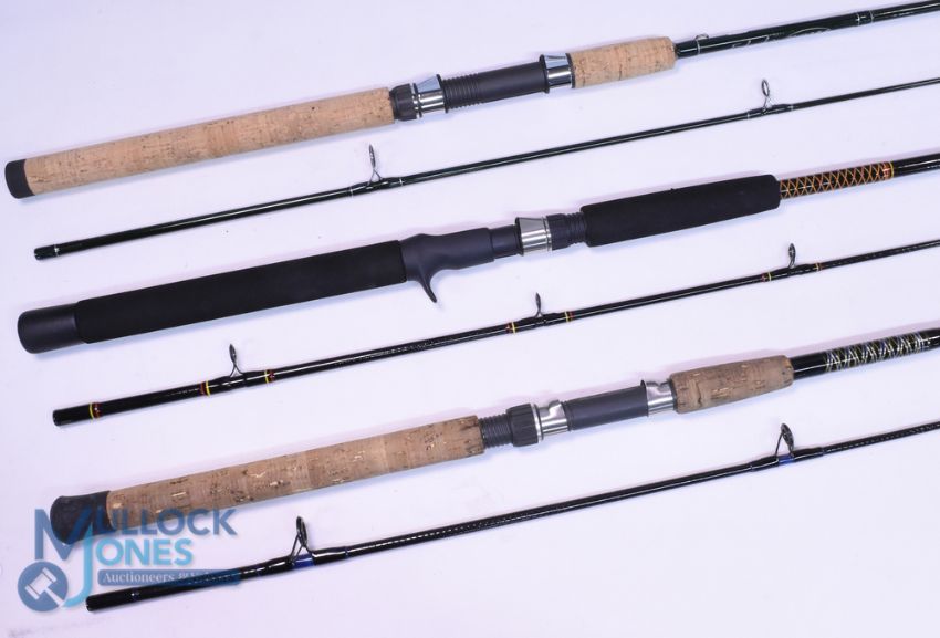 Shakespeare "Ugly Stik" carbon spinning rod 2.4m, 2pc, CW 18-50g, 17" handle, uplocking reel seat, lined rings throughout, MCB. Shakespeare "Ugly Stik" carbon spinning rod 7ft 2pc medium action CW 8-20lb, 20" composite handle, down locking reel seat, lined rings throughout, MCB, very light use. Shakespeare Trion Royality spin carbon rod 7ft 2pc CW 2-15g, 17" handle, uplocking reel seat, lined rings throughout, MCB, looks unused. (3)