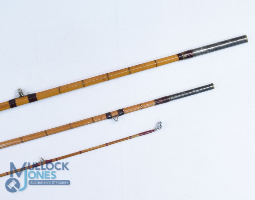 Hardy "The Deluxe" Palakona 9' 3 piece split cane trout fly rod, No. H10753, burgundy close whipped, bronze push ferrules, cork handle with up screw reel seat, comes in MOB