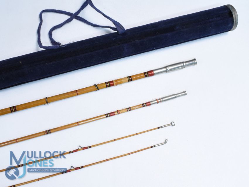 A USA pattern split cane/bamboo fly rod, for restoration, 9' 3 piece with correct spare tip, multi colour whips, nickel ferrules, cork handle and nickel reel seat, comes with blue velvet covered wooden rod former, good project.