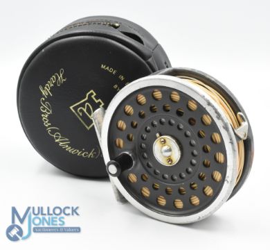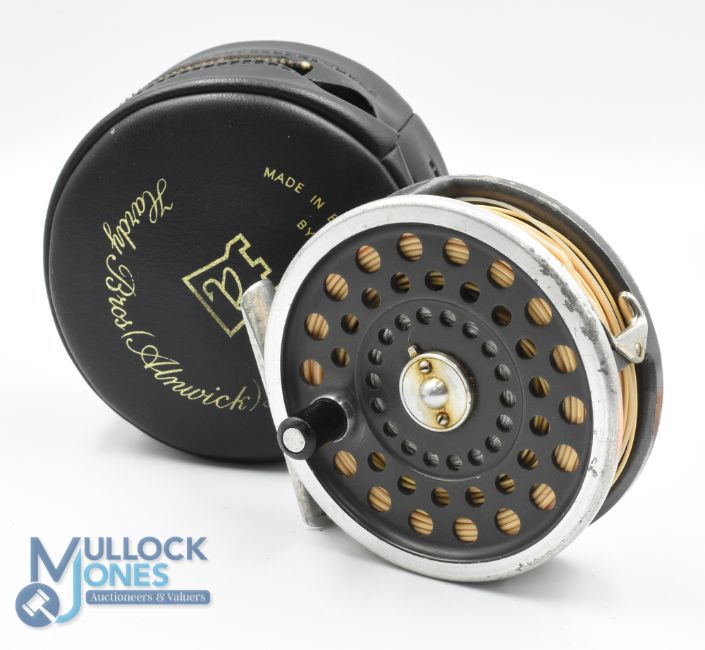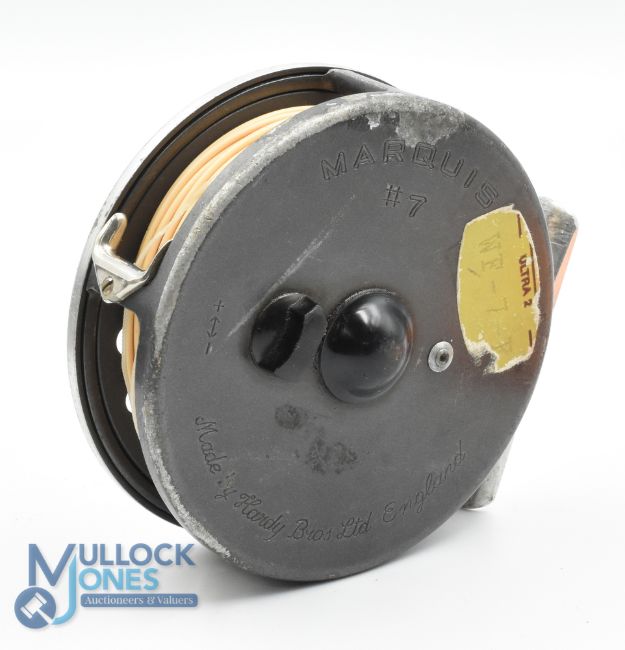 Hardy Bros "Marquis #7" alloy trout fly reel 3 7/16" spool black handle, quick release spool, smooth alloy foot, constant check, U shaped line guide, signs of surface wear apparent, with maker's zip case