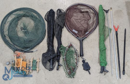 Selection of Fishing Landing Nets, Net Heads, scoop net by Daiwa Wilderness with gear keeper clip, wooden bait lines, Daiwa folding landing net, rode rests