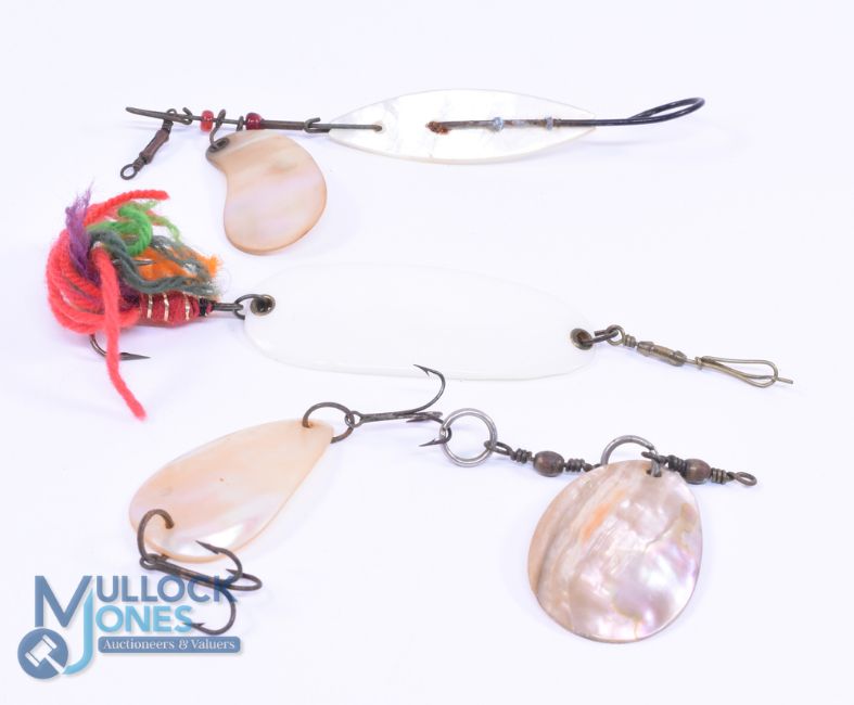 Collection of 4 Mother of Pearl spoons, in blade sizes ranging 2"-3", 1 with forward spinner blade, another with red wool hook and swivel, good early baits. (4)