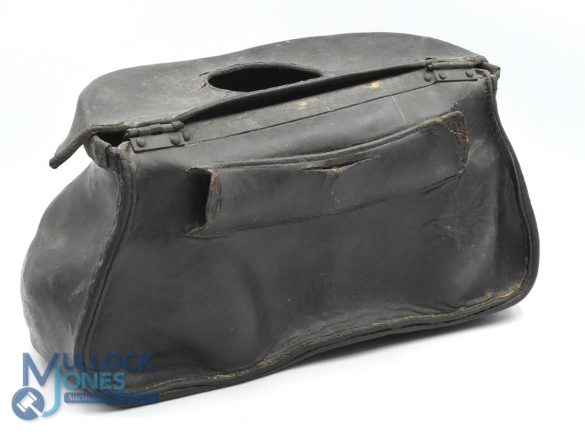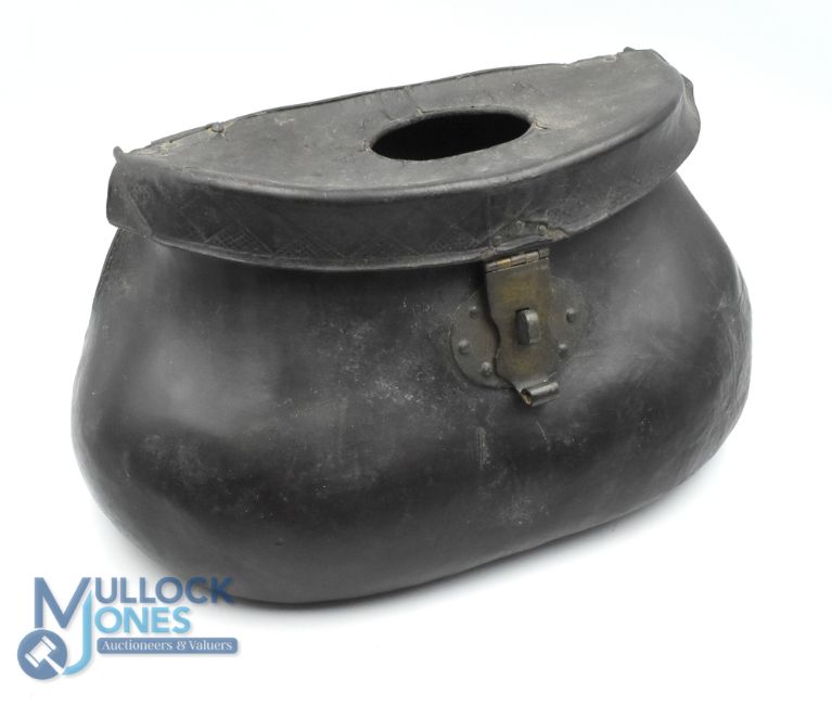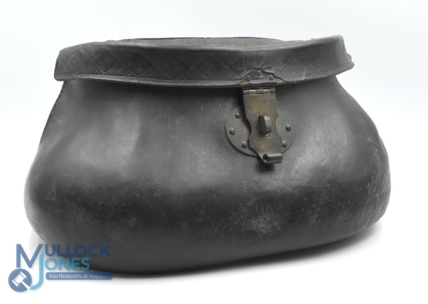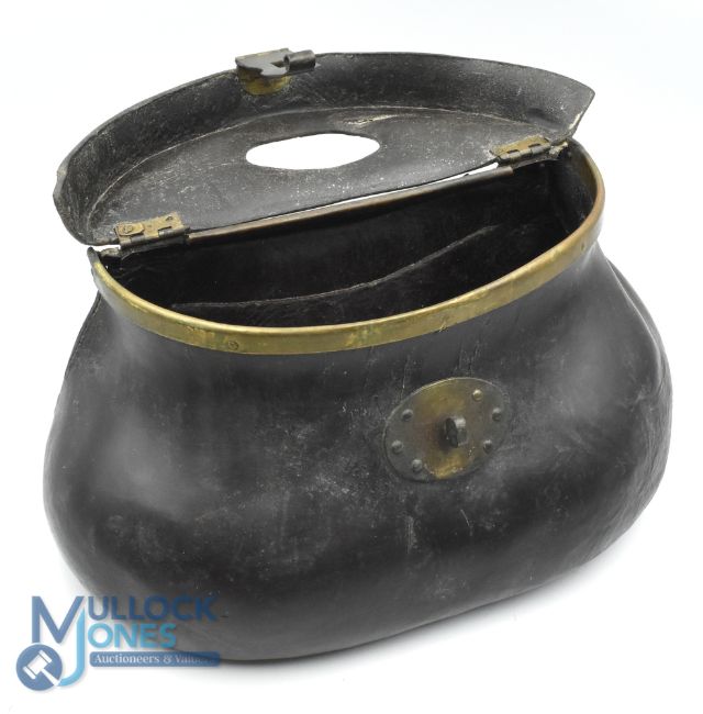 Antique Pot-Bellied Steamed Leather Fishing Creel, with brass fitting lock, hinged lid that has a fine embossed finish to the leather edge and stitched back for strap, size #29cm x 14cm x 15cm