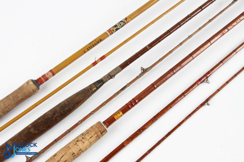 Split cane fly rod by Porter of Wigan 10' 3pc alloy uplocking reel seat, lined butt/tip ring; unnamed greenheart trout fly rod 14" wood handle with alloy fittings; Fario Andelle 2 glass trout fly rod 9' 2pc, alloy uplocking reel seat (3)