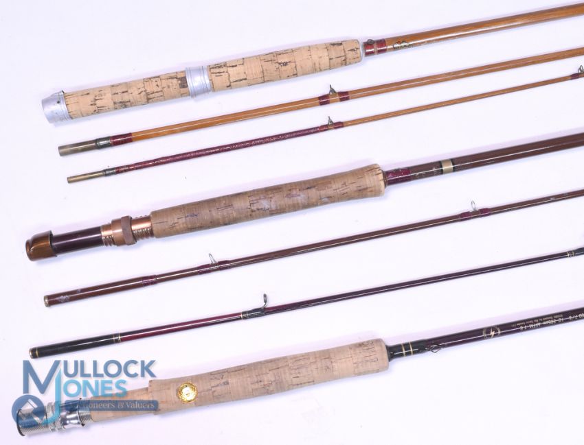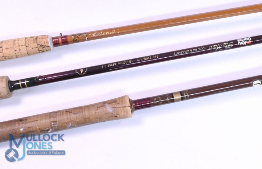 Abu Fly Max grafite trout fly rod 2100-7/8, 10ft 2pc, line 7/8#, alloy uplocking reel seat, lined rings throughout, MCB, light use. Farlow Sharpe Gold Band carbon trout fly rod 8ft 6" 2pc line 6/7#, anodised down locking reel seat, in Sharpe bag. Millwards Redditch "Colt Craft" split cane trout fly rod 6824, 9ft 3pc (tip 6" short), alloy reel fitting and collars, MCB. (3)