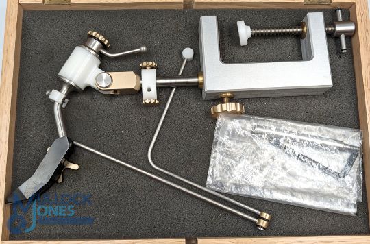 A Fine and Scarce Lawrence Waldron Fly Tying Vice, with original C clamp, stem extension, material clip, bobbin hanger and accessory arm, Alan key in custom built foam lined wooden case G
