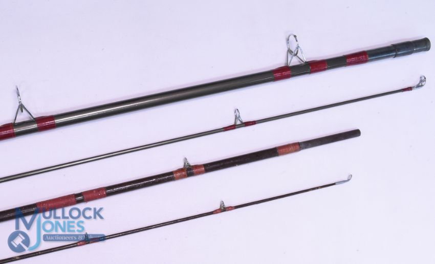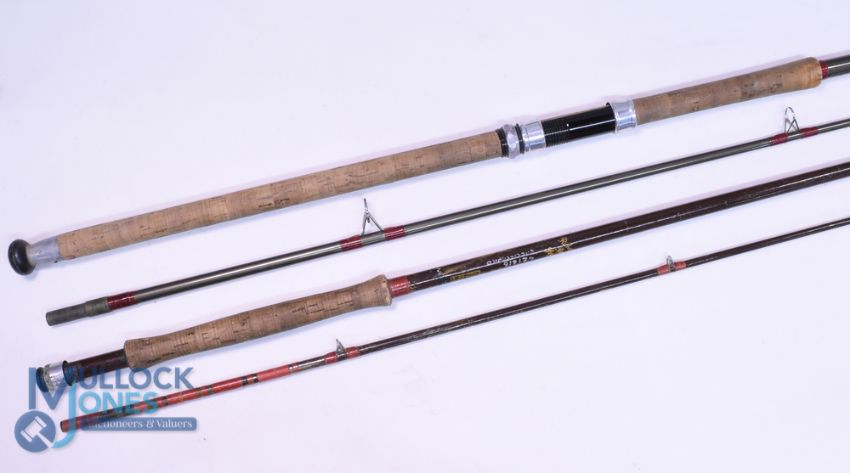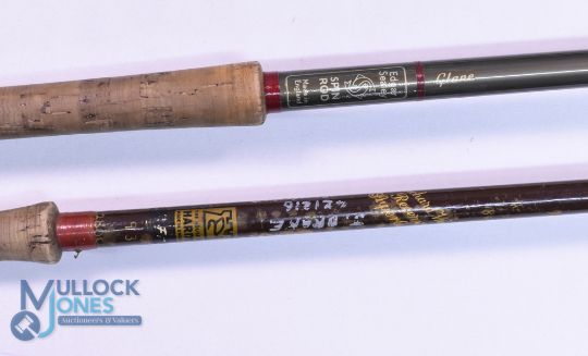 Edgar Sealey "The Glane" hollow glass spinning rod, 10ft 2pc, 282 handle, alloy sliding reel fitting, MCBN. Hardy Richard Walker Reservoir Super Light glass fly rod, 9ft 3" 2pc line 7#, reel seat very stiff, cloth bag, shows signs of use. (2)