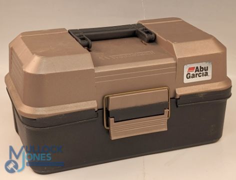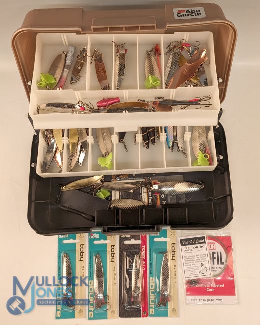 Abu Garcia Cantilever Fishing Tackle Box, with Abu spinner lures, a good clean collection with 4 still on original cards