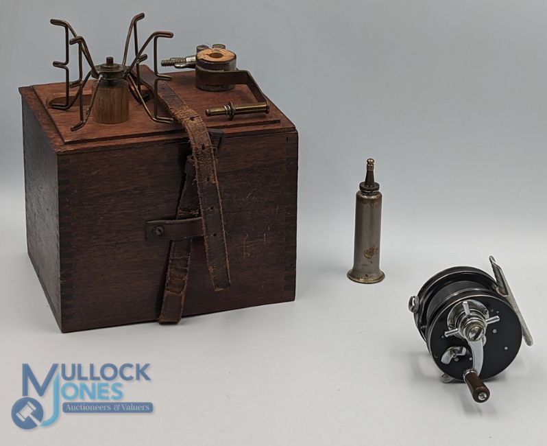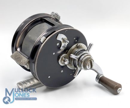 Hardy Bros "The Jock Scott" 2" non level wind HJS baitcasting reel, curved chrome offset crank with tapered handle, weight casting adjuster, thumb post on/locked rim lever, ribbed foot with line winder/rod attachment and oil bottle. In original mahogany box with wrap around strap. Runs very well