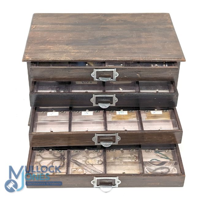 A Fine Hard Wood Fly Tying Tackle Drawer Box, dark stained hard wood box with 4 drawers with chrome plated handles and sectional clear pull top boxes in each for flies, lures, silks, tools etc, comes with a small collection of fly tying accessories of silks, hooks, feathers, flash, tools, tubes size - believed to formally the property of Sir George White founder of British Aeroplane Company #20cm x 23cm x 33cm