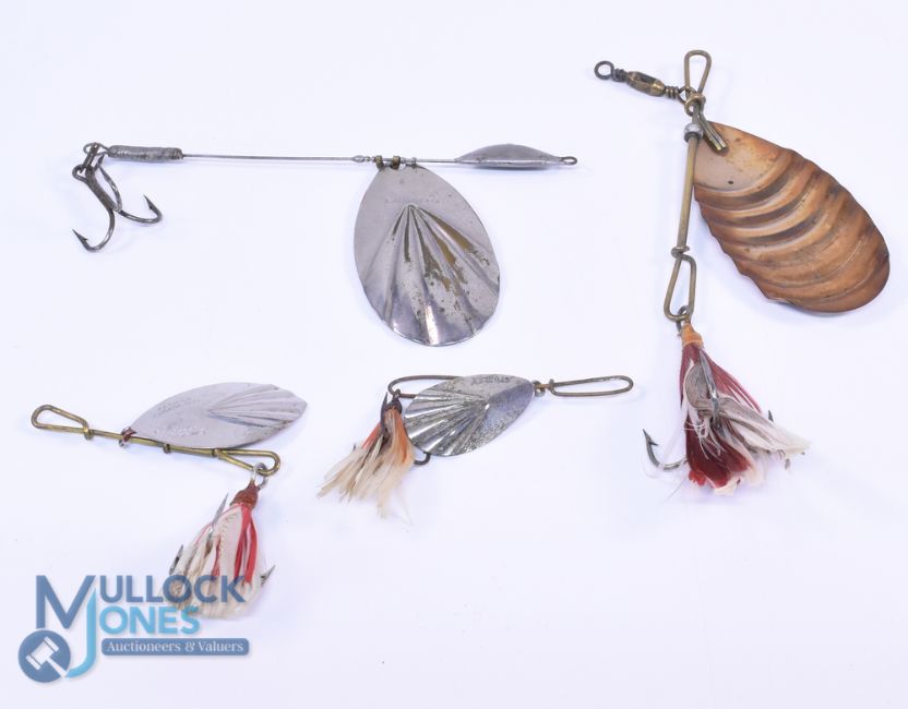 Collection of 4 USA style Bucktail spinner lures, an Allcock fluted spinner size 8, leaded central bar and treble, a 3" ribbed blade with letter C in Diamond trademark, possibly Chapman, a Henry Wilkes of Studley, Redditch 1 1/4" fluted blade spoon and a G M Skinner of Clayton, New York, Patent spinner No. 4 1/2, all good. (4)