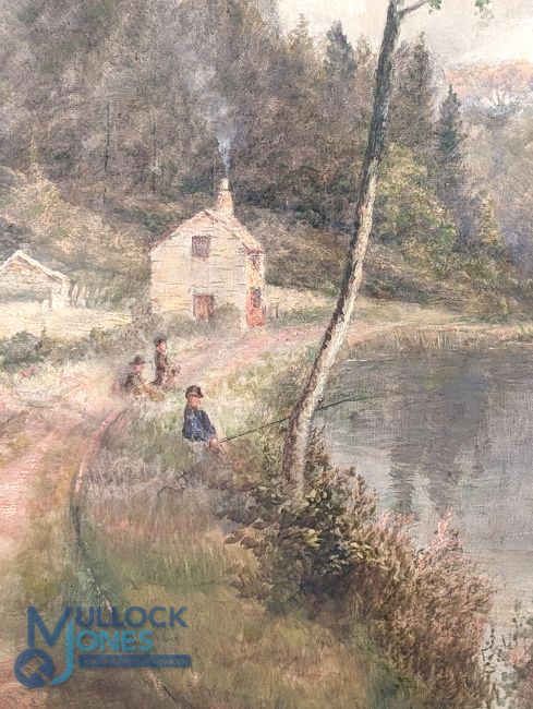 Period Oil on Canvas Fishing at Lake Picture, unknown artist mounted in gilt frame - size 55cm x 70cm