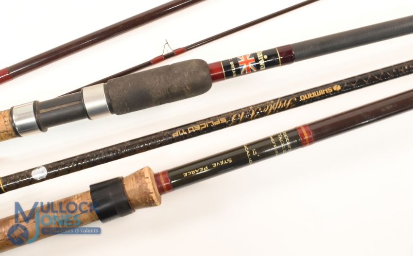 Daiwa carbon match rod 12ft 6" 3pc 24" handle with Fuji down locking reel seat, lined rings throughout, MCB; Beeby's Tackle Sheffield "The Excalibur" carbon match rod, 13ft 3pc 21" handle, sliding reel fittings, stand off rings, cloth bag; Shimano carbon Triple X-13 match rod 13ft 3pc 23" composite handle with uplocking reel seat, stand off rings, cloth bag. (3)