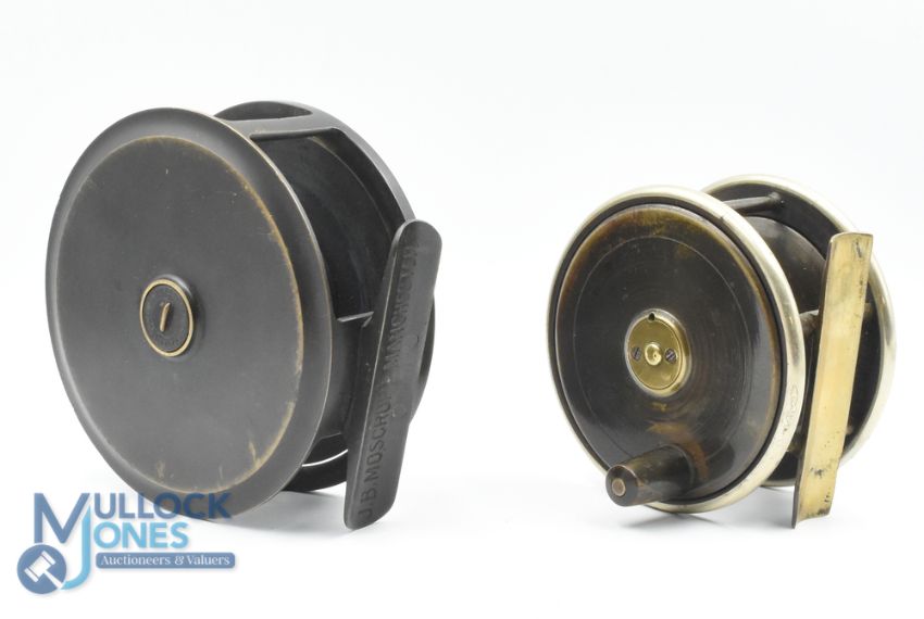 JB Moscrops Manchester all brass 4 1/2" salmon fly reel with central screw tensioner, caged drum core, t/w an unnamed brass and ebonite 3 3/4" wide drum fly reel with nickel silver rims, constant check (2)