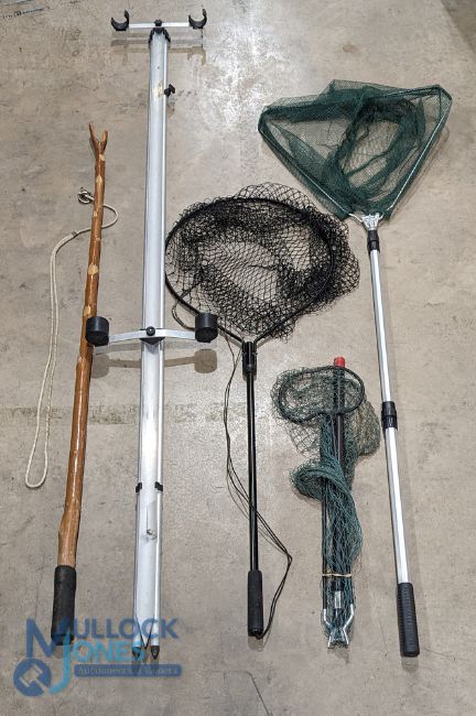 Beach Caster Super Match Rest Tripod, an Aluminium framed rod tripod made by Ian Gold, with a wooden wading staff, Abu Garcia 600 net, and 2 folding landing nets. Collection only