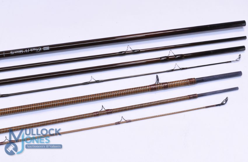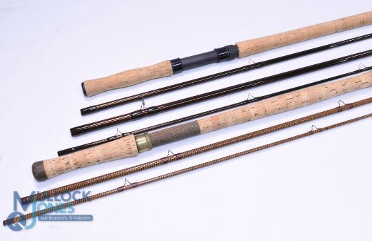 Daiwa Lightening Coil 13' 3-piece salmon fly rod, line #9/10, spiral whipped carbon blank, lined butt/stripper rings, 24" cork handle with screw winch fitting, fine and a Shakespeare Oracle 4, salmon fly rod, 4.2metre, 4-piece graphite travel fly rod, line #10/11, 27" cork handle with screw reel fittings, as new, both rods come in MOB's. (2)