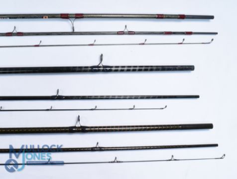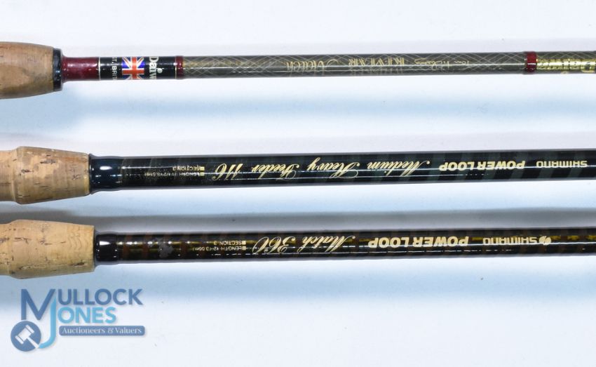 Daiwa Tom Pickering Whisker Kevlar Match Connoisseur light rod WTP1Z 12 ft 3pc 22" composite handle, sliding reel fittings, lined stand off rings throughout, MCB, light use; Shimano Power Loop Medium Heavy Carbon Feeder 116 11ft 6" 3pc 23" handle composite sliding reel fittings, lined stand off rings throughout, MCB; Shimano Power Loop Match 360 carbon rod 12ft 3pc 23" handle composite sliding reel fittings, lined stand off rings throughout, MCB, light use. (3)