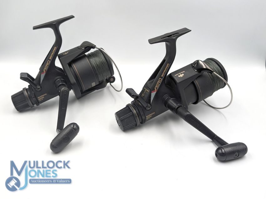 A fine pair of Shimano Aero 6010 bait runner fixed spool reels, each with 2 spare spools (4). Both reels have good bails, twin rear tensioners, very light use and run well (2)