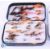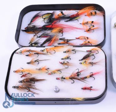 Richard Wheatley black alloy fly tin 6" x 3.5" x 1.5" with swing leaf foam lined with ove4r 70 mixed salmon flies, mixed single, doubles and trebles; Richard Wheatley alloy tin 6" x 3.5" lined with foam, with over 50 salmon trebles. (2)