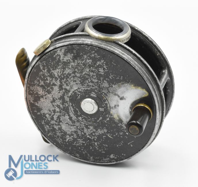 Hardy Bros "The Perfect" alloy fly reel, 3 1/8" spool with black handle, milled rim tensioner, open oval logo, constant check, clear agate line guide. Runs well in green cloth pouch, signs of wear
