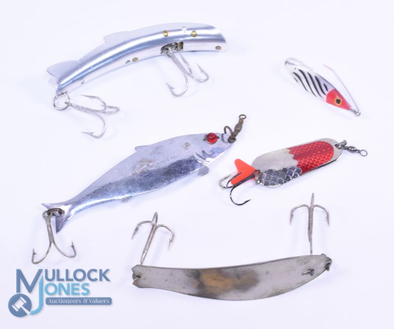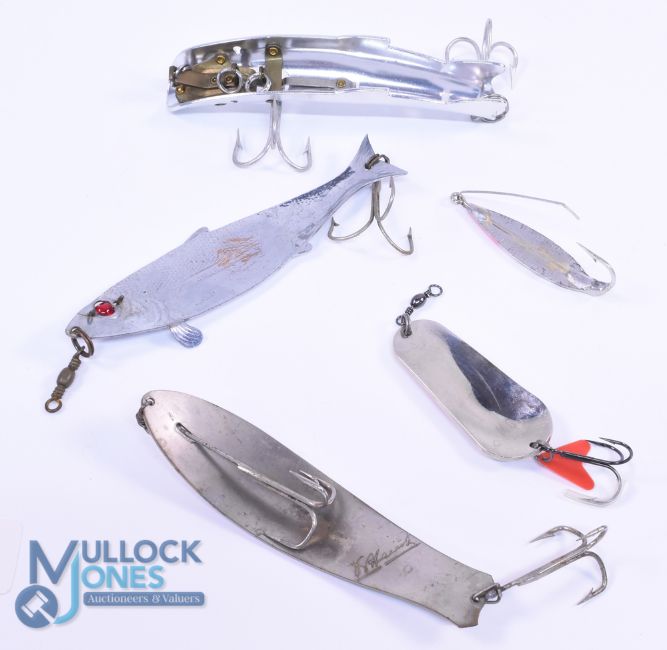 5 USA vintage metal baits, a Nature Patent Pending 5.5" fish shaped metal lure with revolving red eye, hook and swivel, a Helin? 5" leaping fish with brass internals, stamped Patent Pending, a Fred Arbogast No.3 Hawaiian weedless lure and 2 others. (5)