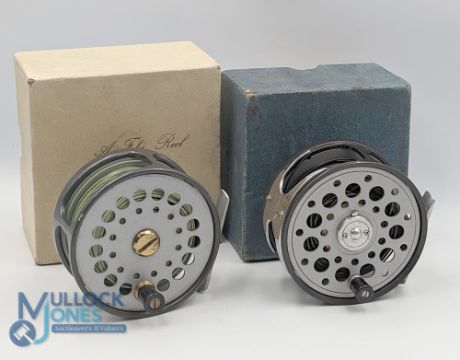 Sharpes of Aberdeen "The Gordon" alloy trout fly reel 3 1/2" wide spool black handle, constant check, in original box, very light use; Farlow London "The Serpent" 3 1/2" wide spool 2 screw latch, constant check, chrome line guide, in box, very light use (2)